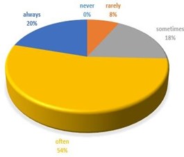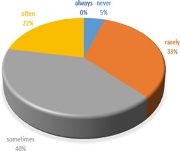 Figure 1 depicts teachers' authentic material use rates, while Figure 2 illustrates teachers' current official textbook use rates during English lessons at high schools in Türkiye. It was clear from the pie charts that roughly three-quarters of participants (72%) always used textbooks, while 20 % percent of the teachers often used these materials. Additionally, the percentages of those against using authentic and nonauthentic materials were nearly identical, at 3% and 5%, respectively. Lastly, none of the participants rated the 'never' or 'always' options in the survey.