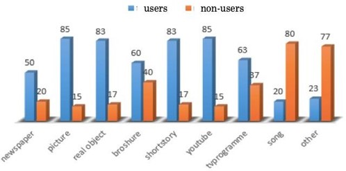 Bar Chart 1 displays that pictures and Youtube videos (for both 85%) were the most commonly used authentic materials in classes. With a slight difference, the real objects and short stories come second (83%). Additionally, more than fifty percent of teachers reported TV programs and brochures as being used, which shows 63 % and 60% percentages, respectively.