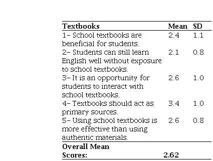 The overall score in Table 2 and Srakang's (2013) framework revealed that teachers had negative thoughts toward textbooks (M=2.62). The highest mean scores for official textbooks (M=3.4) revealed a degree of agreement among teachers on using textbooks as a primary source. Interestingly, according to the same data, teachers reflected that students could learn without textbooks (M=2.1).