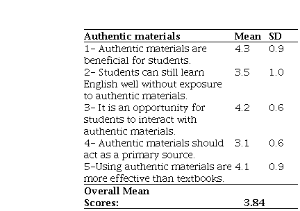 Additionally, the results obtained from overall scores from the scale of the authentic materials in Table 3 (M=3.84) showed that teachers had positive thoughts toward authentic materials (Srakang, 2013). The highest scores in the same data implied that many participants believed in the benefits of using these materials (M=4.3). However, the lowest score showed teachers' concerns about using authentic materials as a primary source in classes (M=3.1). In the interview, when teachers were asked the reasons behind these beliefs, TU and TS reported: