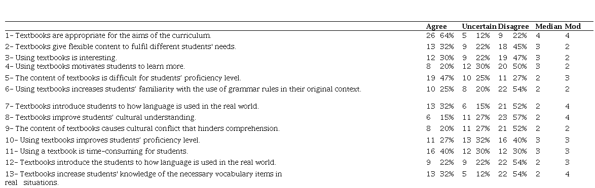 ’Real language use’ was emphasized as another factor influencing teachers' attitudes. Many participants in the survey and interview suggested that textbooks must be more comprehensive to present the real language uses and the target cultural content. In this regard, several participants claimed: