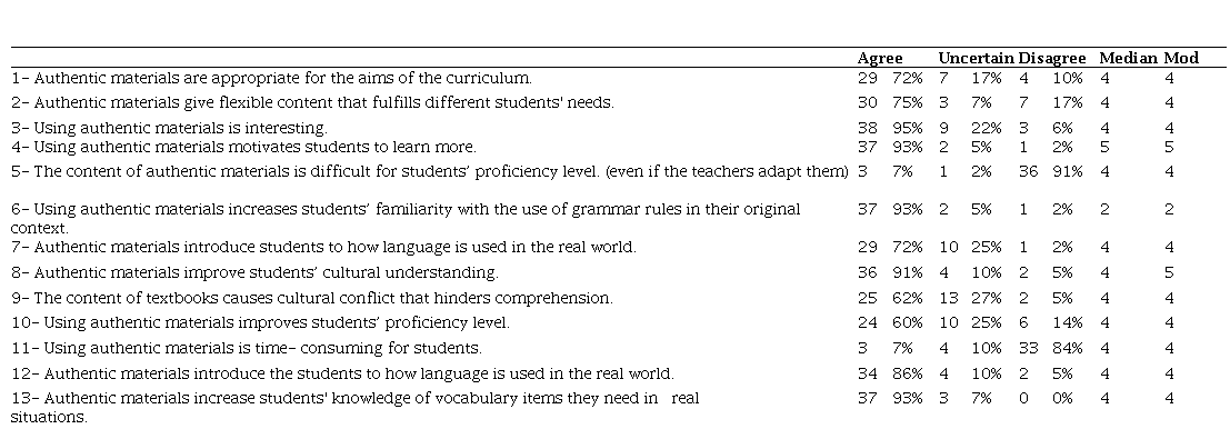 The same data also indicated an agreement (over 90% of participants in the survey) upon the positive effects of authentic materials on increasing interest and motivation during class activities. Two teachers in the interview explained how they could be ' motivating and interesting for students: