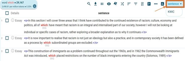 Corpus tools can also be used to teach the difference between complex forms such as the relative pronouns "which" and "that". As shown in Figure 1, SKELL gives the option to display the target word in either KWIC form or sentence form. A teacher can ask students to switch to sentence form and find at least three sentences in each targeted form; "which" and "that". When students gather enough sentences, they start discussing whether clauses and phrases following "which" are necessary or not based on the corpus evidence. Then, students decide on the function of "which" and "that" by exploring the sample sentences and the patterns they appear in.