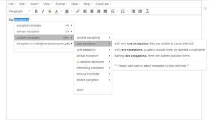 Collocations are a significant barrier for L2 learners; hence several programs have been developed to assist students in choosing the appropriate collocation (Granger, 2015). Collocaid (Frankenberg-Garcia et al., 2019), which is accessed through a free web interface, is a text editor for assisting students with the conventions of academic writing in an interactive DDL approach. Although it is still a prototype, Collocaid can answer such questions as: Is X a typical or appropriate collocate of Y? What words are conventionally used together with X? Collocaid provides options on the correct uses of collocations through multiple concordances via interactive menus (see Figure 2). British Academic Written Corpus (BAWE.), dictionaries and textbooks, crowd-sourced feedback (www.collocaid.uk), and various academic word lists form the database of Collocaid.