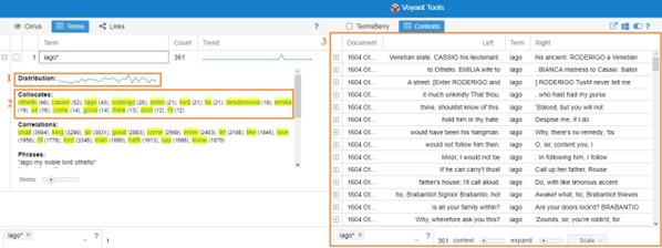 Another versatile web interface that can be directly exploited in a language teaching environment is Voyant Tools (Sinclair & Rockwell, 2016). It is a free, web-based natural language processing (NLP) toolkit, which uses corpus methods to extract information, display measures of frequency, and analyze texts. What differentiates Voyant Tools from other text analysis tools is that it can display multiple visualizations or grid tools simultaneously. As represented in Figure 4 collocations and KWIC related to the word "Iago" are retrieved together. "Iago" is a character from Shakespeare’s play, and this feature of the Voyant tool can come in handy for introducing a new character, setting the scene, and getting students to brainstorm about the topic. Users can either integrate the pre-loaded corpora (mainly literary texts) in the system into their instruction or create their own (learner) corpus and build their instructional strategies on this specialized corpus or a more representative corpus of L1 academic English like BAWE.