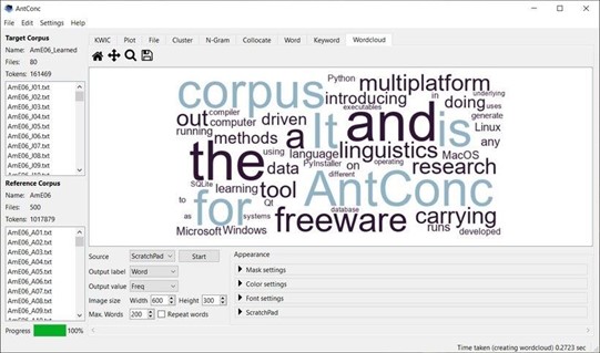 Rather than using a web interface, if an instructor wants to employ stand-alone software and use it in language teaching, AntConc (Anthony, 2022) could be a good option. The software is open-source and widely used by both researchers and language instructors around the world. With Antconc, one can investigate lexical and collocational frequency, create and compare wordlists, explore word clusters and n-grams either in an L1 corpus or a learner corpus (student writings for instance), create word clouds (see Figure 5) to help learners brainstorm on a particular subject before writing, and compare corpora to detect keywords (e.g., L2 English learner corpus vs. BAWE). Those features have the potential to guide language instructors while designing materials (an indirect way of DDL) and help them design in-class activities through which they can present new grammar structures in naturally occurring contexts or introduce academic registers to novice writers.