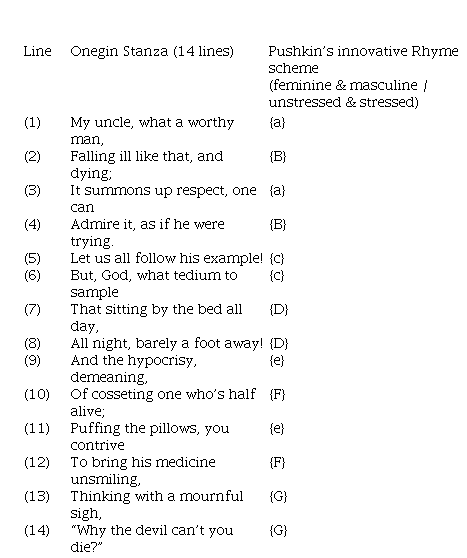 The earlier long classical verse narratives had no specific versification or any prescribed meter. They could be written in blank verse (unrhymed iambic pentameter) or complex stanza forms, including terza rima (ABA BCB CDC etc.) and ottava rima (ABABABCC), but the stanza most specifically associated with the modern verse novel is the “Onegin stanza” or “Pushkin Sonnet”, invented by Pushkin in his iconic Lyrical-Epic entitled “Eugene Onegin”. His innovation is similar to the Shakespearean sonnet, retaining the 14-line stanza with three quatrains plus couplet structure but Pushkin made it distinct in two ways (Remnyova M. L. et al., 3.1.8.)