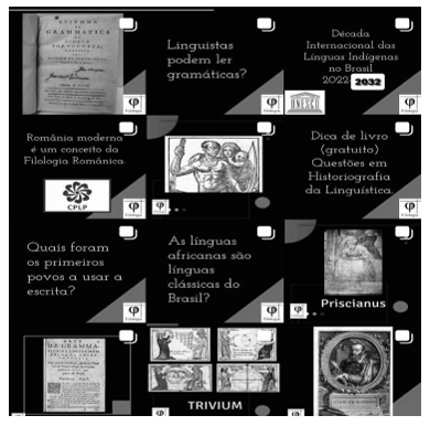 As postagens remetem a temas que são tratados por comunidades de linguistas, mas adaptadas para que o público em geral do Instagram possa acompanhar. São temas reais da área de Historiografia da Linguística, recortados de debates teóricos desenvolvidos em apresentações de congressos e artigos acadêmicos. Esse recorte “metonímico” parece ser o método mais eficiente na construção de um “carrossel” científico, que se utiliza do recurso textual e visual.