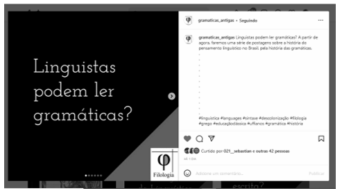 O artigo trata de uma página do Instagram, chamada Gramáticas Antigas. Essa página é dedicada ao tema da gramática, mas em uma perspectiva histórica. A página apresenta a história da gramática no Brasil, indo das obras mais antigas, ainda da época da colônia, passando pelo período do Império, até nossos dias. A página responde a perguntas como: qual gramática era usada no Brasil para ensinar português no século XIX? Quais gramáticas estavam em uso à época da chegada dos portugueses, em 1500? É surpreendente sabermos que no Brasil, à época da colônia, foram escritas gramáticas para ensinar línguas indígenas e até uma língua da África. A página Gramáticas Antigas do Instagram é uma viagem no tempo, pela história do conhecimento linguístico no Brasil. O artigo explica como essa página surgiu, a equipe que a desenvolve, e porque temos interesse em divulgar a ciência nas redes sociais, o que chamamos de popularização. A página serve também como um canal de contato com o grupo de pesquisas que a desenvolve, o grupo “Filologia, línguas clássicas e línguas formadoras da cultura nacional” (FILIC/CNPq/UFF), sediado na Universidade Federal Fluminense.