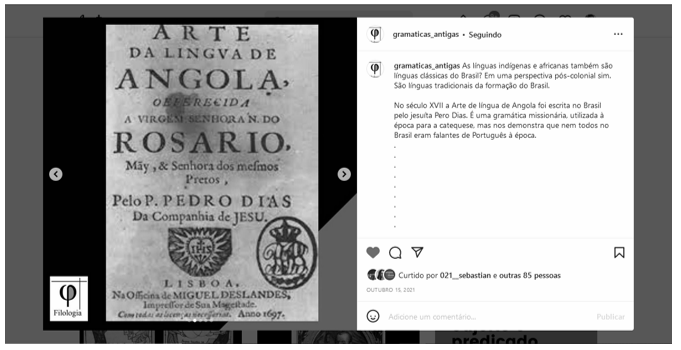 A partir do texto “Gramáticas Antigas: popularizando a historiografia linguística no Instagram” é possível acompanhar um olhar da Linguística para o passado, por exemplo, para as primeiras gramáticas que chegaram ao Brasil colonial. Os autores mencionam, entre outros compêndios, uma gramática da língua de Angola, escrita no país pelo jesuíta Pedro Dias, além de tematizarem as implicações de tais obras na formação do português brasileiro contemporâneo, em um percurso identificado como “uma viagem no tempo, pela história do conhecimento linguístico no Brasil”. O objetivo da popularização da Linguística não é a alfabetização dos que nada sabem para que possam acompanhar um raciocínio desenvolvido ao longo do texto, mas fazer o leitor entender as linhas gerais, a ideia, não o conceito ou termo técnico.