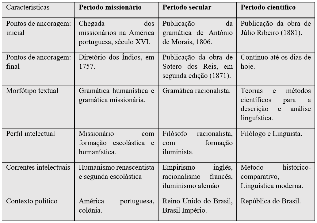 Categorizamos o período missionário como um período pré-moderno, o período secular como uma entre-modernidade e por fim o período científico como moderno, em relação ao alinhamento com o desenvolvimento de pensamento linguístico no mundo ocidental. Os círculos intelectuais da América portuguesa do período missionário, entre os séculos XVI e XVIII, na pré-modernidade, eram formados por teólogos de ordens religiosas, enquanto os círculos intelectuais do período secular, nos séculos XVIII e XIX, eram formados por acadêmicos com formação de cunho filosófico-iluminista; já os círculos intelectuais do período científico, dos século XIX em diante, eram e são formados por cientistas, como trabalhadores especializados.