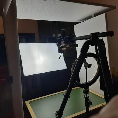 A primeira dificuldade nessa etapa foi a iluminação. O primeiro vídeo, em particular, teve problemas relevantes de oscilação de luz devido à recalibração automática da câmera (configurada no modo automático de cenas dinâmicas) na transição entre fotos e a ausência da caixa refletora (presente na Figura 1). Os problemas implicaram não só na qualidade do vídeo, pois a variação de iluminação é perceptível no produto final, mas também no processo de edição, pois foi necessária a aplicação de filtros em diversas circunstâncias para amenizar a oscilação. No segundo vídeo, sob a orientação de um fotógrafo, foi possível ajustar manualmente as configurações de fotometria da câmera (ISO, abertura e velocidade) e mantê-las fixas durante toda a gravação, com o cuidado de manter constantes também as fontes de luz (o que envolveu cobrir todas as fontes de luz natural do ambiente, uma vez que a luz natural varia ao longo do dia). Parte desse problema se deveu ao fato de a gravação ter sido realizada em casa, fora de um estúdio profissional.