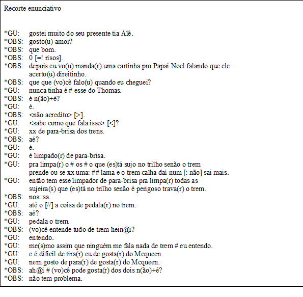 O recorte enunciativo[7] que ilustra nossa reflexão advém dos estudos de Del Ré (2016) e faz parte do acervo do grupo de pesquisa NALingua. Estamos usando as normas de transcrição assumidas pelo grupo NALingua, mas com alguns ajustes derivados da particularidade do olhar que assumimos neste trabalho. Estão presentes na situação enunciativa o Gu, menino de 5 anos e 10 meses, a mãe do Gu e a pesquisadora/observadora. Na transcrição, GU representa a criança e OBS denomina a pesquisadora-observadora. Gu está colorindo desenhos de trem em uma mesa colocada na sala da casa dele e, enquanto vai colorindo os desenhos com suas canetinhas, surge a seguinte narrativa.