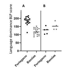 The preliminary data on the language dominance score evaluation in 23 BraPoRus participants are shown in Figure 1 (SKOROBOGATOVA; SMIRNOVA HENRIQUES; MADUREIRA, 2021). Most of heritage Russian speakers, 18 out of 23, were dominant in their society language, Portuguese (Figure 1А). In this group, seven participants were born in Brazil, other eleven arrived at the mean age of 7.8 years. The data obtained from other five participants are shown on Figure 1B. One of them was a balanced bilingual (the final dominance score -1.45, age of arrival 10 years). Four participants were dominant in Russian, their ages of arrival range from 14 to 17 years. A strong negative correlation was found between the age of arrival to Brazil and BLP score (Spearman R = -0.76, p = 0.0006).