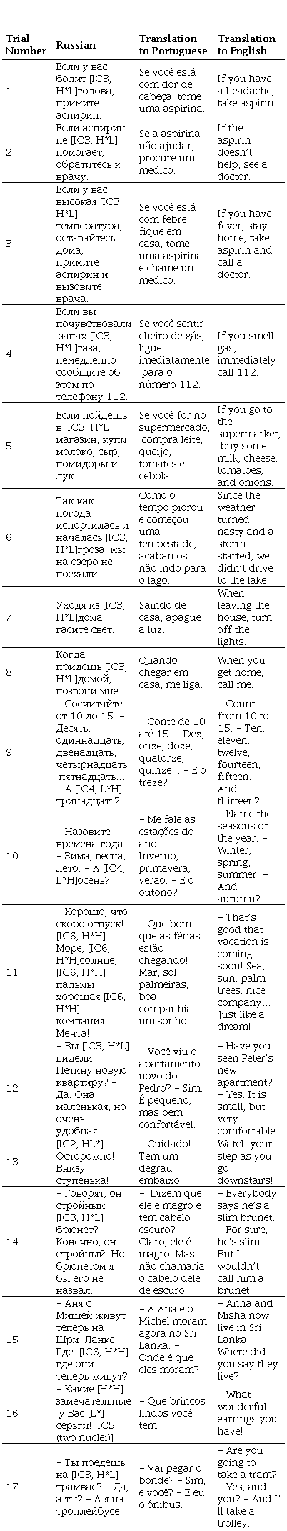 Intonation task. The team of Dr. Skrelin from Saint Petersburg State University constructed the set of 17 trials (phrases or short dialogues) in Russian specifically for research of cross-linguistic influence on intonation between Russian and other languages. The initial set of 11 trials, developed by Nina Volskaya to study the perception of Russian rise-falls by speakers of other languages, was extended to encompass other melodic types that may be specific for the Russian intonation system. The trials were tested on speakers of German (SKRELIN, 2017) and Finnish (unpublished).