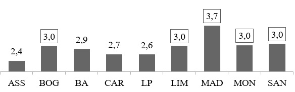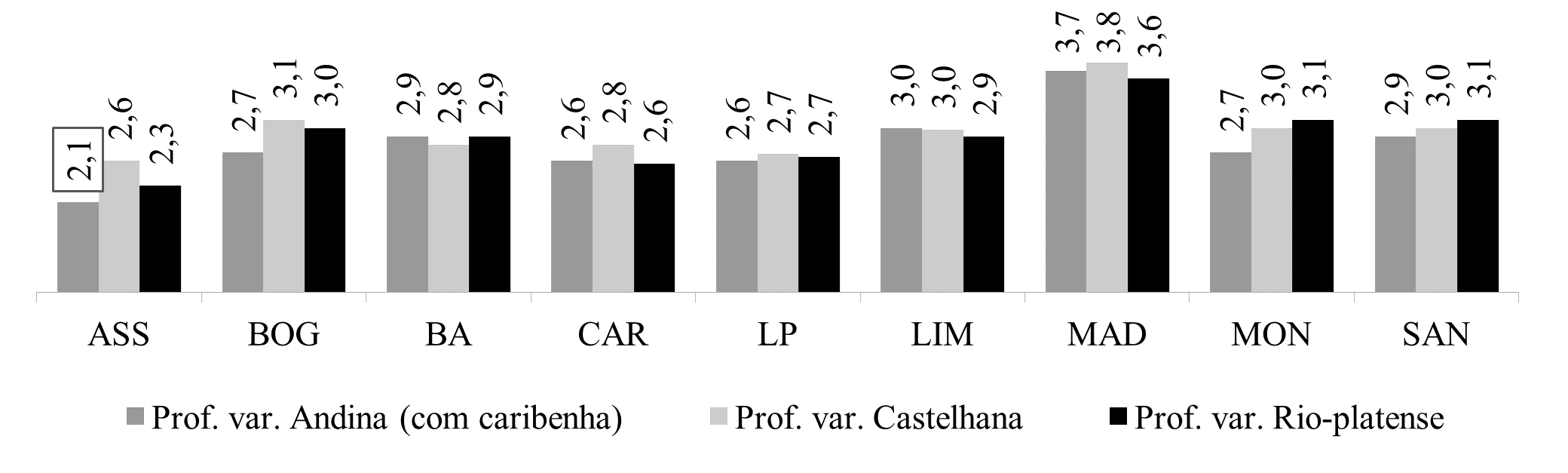 No lado oposto, Madri recebe as melhores valorações por parte de quase todos os grupos. Em B2 de professor rio-platense é superada por Buenos Aires com um 3,8 frente a um 3,6 de Madri, a mesma pontuação que recebem Montevidéu e Santiago. Poderíamos estar ante um dos poucos exemplos de influência da variedade do professor, dada a tendência geral a situar a capital espanhola no primeiro lugar no quesito pesquisado. É justamente um grupo com professor de variedade rio-platense (de nível C2), quem avaliou Madri com o valor máximo (4), seguido por outro de variedade castelhana (nível C1, valor 3,9) e andina (com caribenha) (nível B2, valor 3,8).