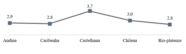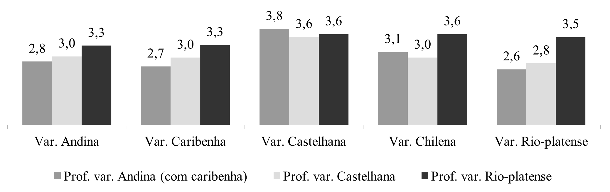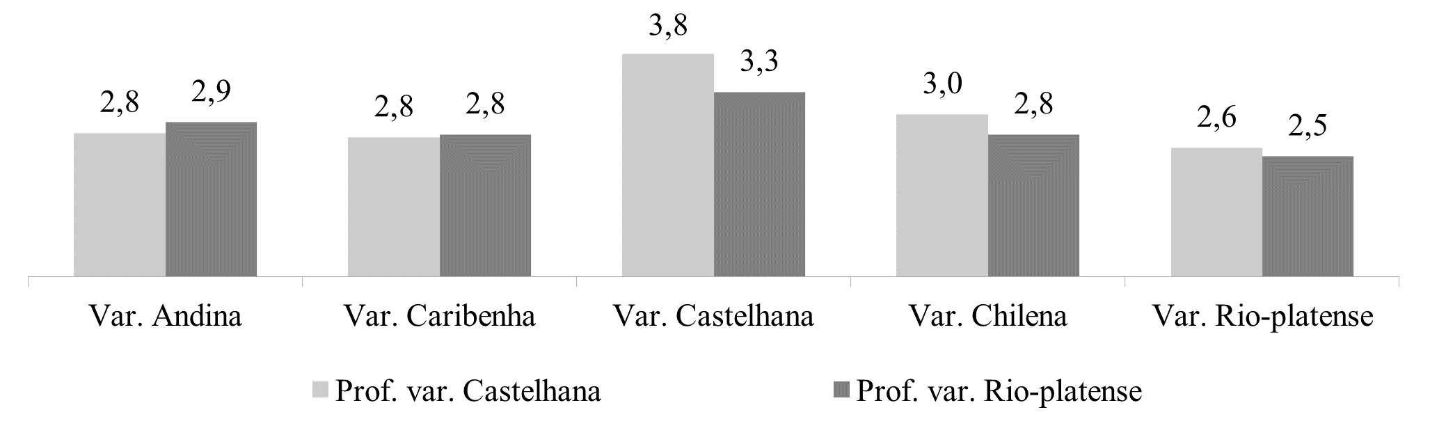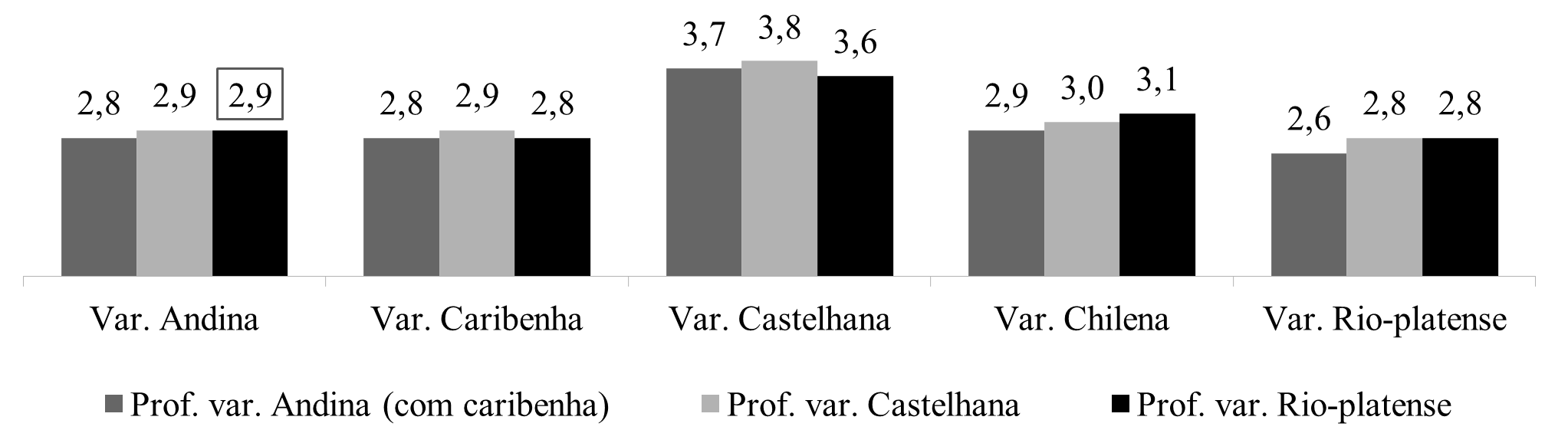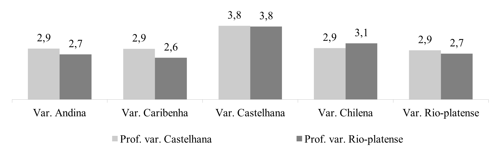 Os dois grupos avaliaram com o mesmo valor, 3,8, a variedade castelhana, que se destaca sobre o resto com grande diferença. Embora com valores muito similares entre os dois grupos de dados comparados, as variedades andina, caribenha e rio-platense recebem avaliações levemente mais altas por estudantes de professor de variedade castelhana. No caso da variedade chilena, são os informantes de professor de variedade rio-platense os que outorgam o valor maior, 3,1. Todas as variedades (salvo o destaque da castelhana já comentado) situam-se em valores positivos, de forma mais moderada no caso dos estudantes de professor de variedade rio-platense, e no entorno do 3 no outro grupo considerado. A influência da variedade do professor, portanto, parece não ser muito acentuada, já que entre os dois grupos as variações na avaliação de variedades ficam entre 0,2 e 0,3.