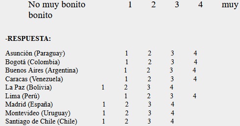 Como pode ser verificado, os informantes consideraram o espanhol de Madri o mais bonito, e o situaram, com 3,7, perto do ponto máximo da escala (4) e destacado sobre o resto com uma diferença de 0,7 com relação a Bogotá, Lima, Montevidéu e Santiago, que foram colocadas atrás dela, todas empatadas (com 3). Buenos Aires apareceu imediatamente depois, com praticamente a mesma cifra (2,9). Na parte baixa figuraram Assunção, que ocupou a última posição, mais Caracas e La Paz. A capital paraguaia foi a única avaliada com valores abaixo de 2,5, o ponto neutro, sendo, portanto, a única valorizada negativamente, enquanto Caracas e La Paz situaram-se apenas acima desse ponto neutro.