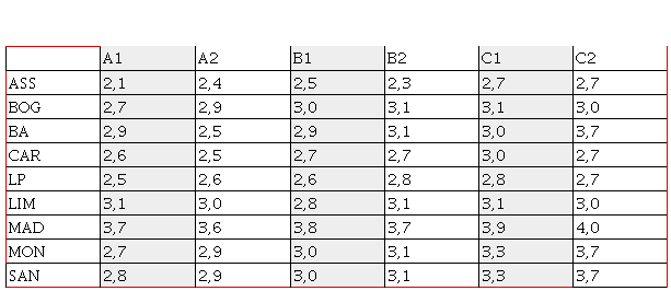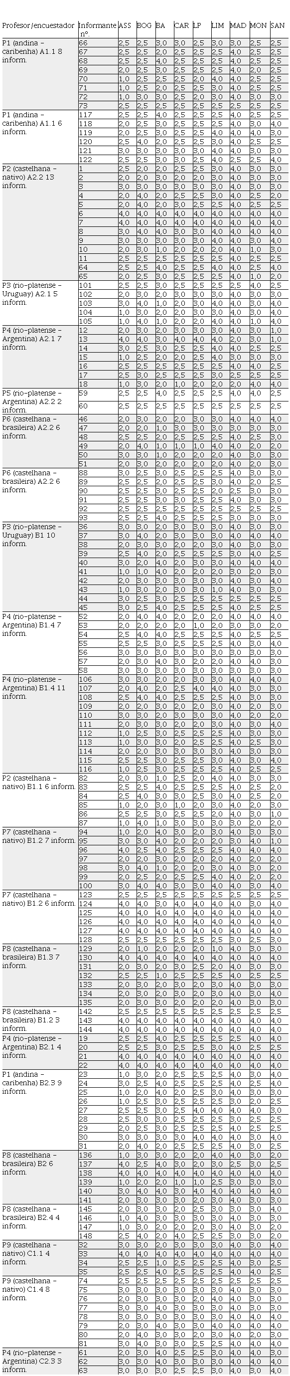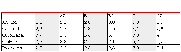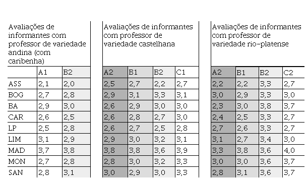 Como pode ser verificado, a situação se repete na tabela acima, com Madri destacado em todos os níveis, apresentando as avaliações mais altas em C1 (3,9) e em C2 (4, o valor máximo da escala). No extremo oposto da escala, Assunção ocupa o último lugar em todos os casos, com cifras de avaliação negativas nos níveis iniciais, porém melhorando levemente com o aumento do domínio da língua dos informantes até valores neutros (níveis B) e, por fim, positivos (níveis C). Essa tendência a melhorarem as avaliações nos níveis superiores (C), quando comparados com os iniciais (A), é extensível para quase todas as capitais consideradas, embora em graus diversos, salvo Lima, que mantém os mesmos valores positivos em A e em C. La Paz, por exemplo, aumenta os valores levemente, enquanto Buenos Aires, Montevidéu e Santiago conseguem incrementos mais expressivos nesse passo de A para C. No caso das últimas duas capitais mencionadas, a subida é progressiva em cada um dos níveis de domínio. Bogotá também experimenta um aumento na sua avaliação, moderadamente, de forma progressiva até os valores – iguais – de B2 e C1 e Caracas progride entre A2 e C1.