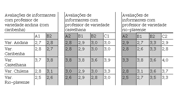 Em geral, os dois grupos atribuíram valores moderadamente positivos para todas as variedades. A cifra mais baixa foi o ponto neutro que recebe a variedade rio-platense por parte do grupo com professor da mesma variedade. Os valores mais altos foram os acima apontados sobre a variedade castelhana (3,8 e 3,3). Em segundo lugar ficaram a chilena (grupos com docente de variedade castelhana) e a andina (para os de professor da rio-platense).