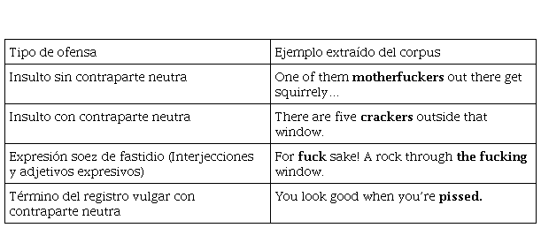 Por último, delimitamos un grupo llamado “términos del registro vulgar con contraparte neutra”, que corresponde a una gran parte de nuestro corpus, con casos como bullshit, ass, fucked up, give a shit, etc. Lo que unifica a este grupo es que se trata de términos vulgares que, además del componente expresivo, poseen un componente descriptivo, a diferencia del grupo anterior. Esta categoría tiene un punto en común con los insultos de grupo, ya que ambas incluyen términos y expresiones que son fácilmente neutralizables.