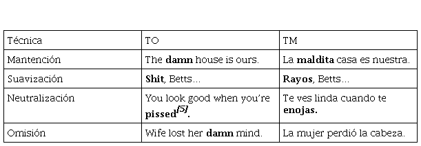 Tomamos la definición de “técnica de traducción” de Hurtado Albir, quien señala que una técnica de traducción es un procedimiento visible en el resultado final, utilizado para obtener la equivalencia (HURTADO ALBIR, 2011, p. 268). Nos basamos asimismo en la propuesta de modelo de análisis del lenguaje ofensivo en el subtitulado de Ávila-Cabrera (2015ª y 2020), en el cual distingue las siguientes técnicas utilizadas en el subtitulado para realizar el trasvase de la carga ofensiva: la suavización, la mantención, la intensificación, la neutralización y la omisión de dicha carga. Para el presente trabajo, dejaremos fuera la intensificación, porque el contraste que nos interesa es el que se da entre la mantención y la supresión de la carga ofensiva. El fenómeno de intensificación, por tanto, no forma parte de nuestros objetivos.