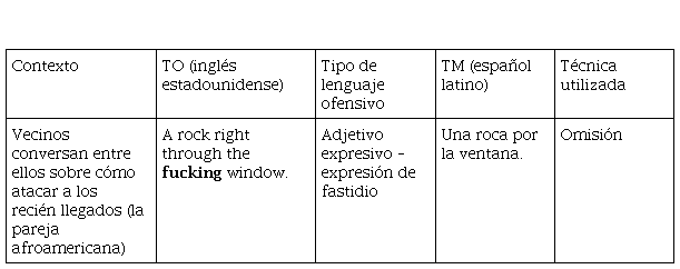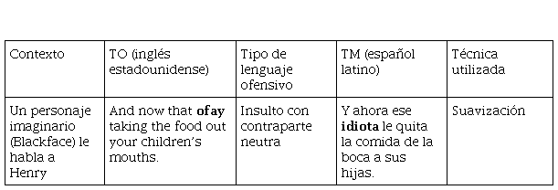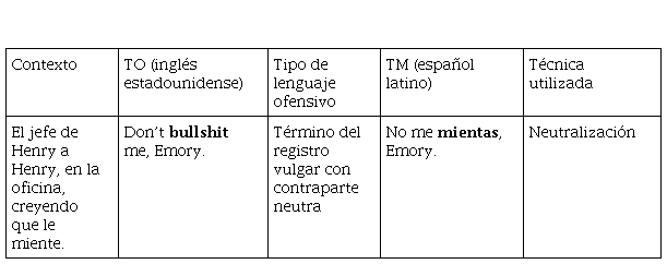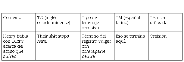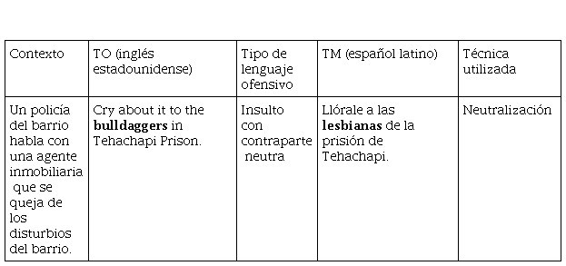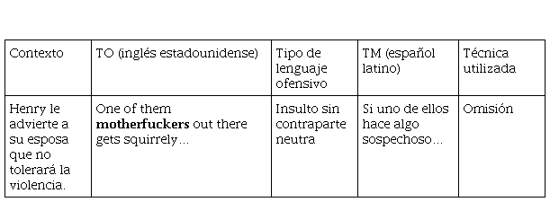En esta sección proporcionamos algunos ejemplos de los casos encontrados en el corpus. Dividimos la tabla en las siguientes columnas: contexto, para agregar información acerca de los personajes y la información visual, TO, con los ejemplos en inglés estadounidense, tipo de lenguaje ofensivo, según las categorías en que dividimos nuestro corpus, y TM, con los ejemplos extraídos del subtitulado. La última columna de la tabla hace referencia a la técnica utilizada, siguiendo la taxonomía mencionada anteriormente.