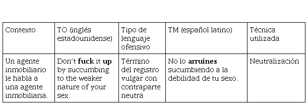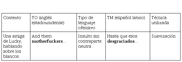 Otra posible pista podría ser la consideración, por parte de los subtituladores, de que la carga ofensiva se transmite mediante la imagen y el sonido y, por tanto, para poder transferir el TO al subtítulo lo más conciso posible, se puede prescindir del lenguaje ofensivo. En su investigación sobre la película Jackie Brown (TARANTINO, 1997), Tamayo Masero (2015) observa que la pérdida pragmática en segmentos específicos que contienen lenguaje coloquial o slang no resulta necesariamente en una pérdida de la carga ofensiva, ya que otros elementos visuales o lingüísticos, aparte del lenguaje de registro bajo, ayudan a mantenerlo. Sin embargo, es discutible que la imagen, el sonido y otros elementos lingüísticos sirvan siempre como apoyo para compensar la pérdida de la carga ofensiva del lenguaje.