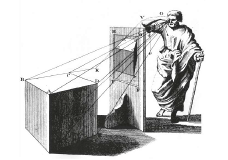 L'avènement de la photographie à partir du modèle de la perspective est également soutenu par le fait que les lois de la perspective centrale ont trouvé leur équivalent technique dans la camera obscura, celle-ci étant à son tour un précurseur direct de l'appareil photographique. Comme on sait, la camera obscura est basée sur un phénomène optique pouvant être observé dans une chambre noire à l'intérieur de laquelle l'image du monde extérieur entre par un petit trou. Cette image se reflète sur le mur opposé au trou et y apparaît à l'envers. Au départ, les camerae obscurae étaient des salles fixes, mais à partir du début du xvne siècle, elles sont devenues de plus en plus mobiles et ont plus tard été utilisées, souvent au cours de voyages, comme aide pour le dessin. Le principe de la projection reste le même dans les aides au dessin qui deviennent de plus en plus pratiques et compactes. Ce principe, qui correspond à la physiologie de notre œil, est également entretenu par les lentilles des appareils photographiques. Ce qui se passe dans la camera obscura se retrouve donc aussi dans la caméra photographique, sauf que l'image, au lieu d'apparaître temporairement sur le mur, est enregistrée par des surfaces sensibles à la lumière.