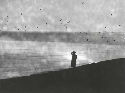Continuando la visione comparata, alle «fila d'animé» del terzo verso paiono alludere diversi tipi di presenze, in modo particolare delle sagome fantasmatiche ed evanescenti allineate sulla spiaggia o le successive figure in maschera schierate in fila. Rispetto alla terza strofa della poesia il ciclo offre altre corrispondenze, a partire dal comune ambiente marittimo; la presenza di un gatto colto in movimento è invece considerabile a tutti gli effetti quale «segno di vita», confermato ulteriormente dalle immagini che evocano il rapporto paterno di un adulto e un bambino sulla spiaggia, cui segue la ripresa aerea delle teste di alcuni bagnanti che punteggiano la superficie del mare. Un ulteriore richiamo alla poesia è costituito dalla ventiduesima stampa (fig. 2), caratterizzata dai toni soffusi della gamma tonale dei grigi, che esprime l'atmosfera di incanto e sospensione lirica mutuata dalla poesía mostrando una figura scura solitaria sulla spiaggia intenta a scrutare, con la mano portata alla fronte, il mare popolato di gabbiani.