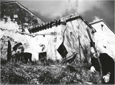 Il tema délia perdita, del crollo, si sviluppa poi nella serie in una copia di immagini in cui sono ritratti uomini anziani ripresi attraverso un registro stilistico che infonde un senso di straniamento e inquietudine, mettendo in evidenza non la fisicità delle figure, che appare sbiadita, ma le loro ombre. A questi due scatti segue un'altra coppia in cui appaiono persone anziane assieme a soggetti vestiti con costumi tradizionali intenti a celebrare, con musiche e canti, la Festa contadina di Cantamaggio: rievocazioni di un passato popolare in via di estinzione a cui Giacomelli guardava con un senso di rimpianto.
