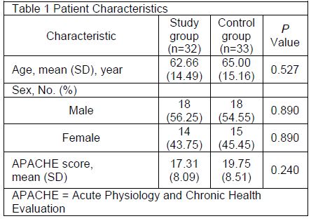 There were 65 patients admitted to the medical ICU during the study days. There was not significantly different with respect to age, sex, and APACHE score between study and control groups (Table 1).