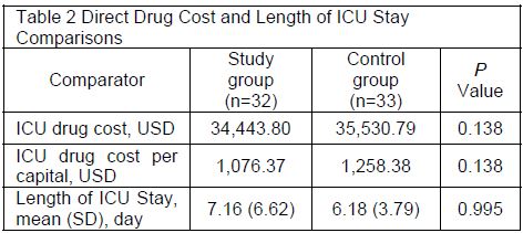In term of direct drug cost per capita, it was 1,076.37 USD in study group compared with 1,258.38 USD in control group. The difference of direct drug cost between two group was 182.01 USD, but did not statistical significant (p=0.138). The average LOS was 7.16 days (SD 6.62) in the study group and 6.18 days (SD 3.79) in the control group (p=0.995) (Table 2).