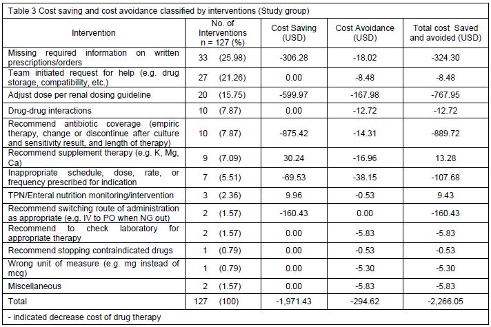 The number of adverse drug events and the subsequent cost of these events can be reduced by pharmacist intervention.3-5,10-18 In the current study, we aims to describe the characteristics of the interventions and to determine pharmacist’s interventions led to change in cost saving and cost avoidance in an intensive care unit (ICU). This study documented a role for a pharmacist in a multidisciplinary ICU, and demonstrated a substantial reduction in drug costs as a result of pharmacist - initiated therapeutic consultations / interventions.