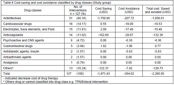 In addition, cost saving and cost avoidance were classified by drug class. We found that anti-infective was the major cost reduction (1,958.61 USD) followed by anticoagulants (132.36 USD). The most common drugs used in ICU were anti-infective, cardiovascular drugs, electrolytes trace elements and fluid, and anticoagulants, respectively, which required more interventions than other drugs (Table 4).