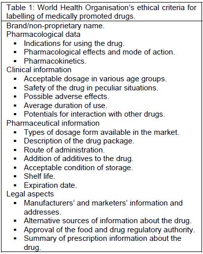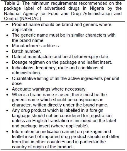 The South African Medicines Control Council has drug advertisement policies as contained in the South African National Drug Policy26 which does not totally conform to the WHO’s recommendations on drug advertisement. Drug policy in Nigeria was very weak until 1989 when legislation was passed to make effective a list of essential drugs in the country. The regulation was also meant to limit the manufacture and import of fake or sub-standard drug and to curtail false advertising.27 The National Agency for Food and Drug Administration and Control (NAFDAC) is charged with the responsibilities of regulating local manufacturing, importation, exportation, advertisement, sales and distribution of processed foods and drugs in Nigeria. These processes are done in accordance with Decree 19 of 1993 as amended by food, drugs and related products (registration) Decree No. 20 of 1999.28 Drug policy in Nigeria requires that locally manufactured, imported and advertised drugs should be clearly labelled. The labelling should be informative and accurate. The minimum requirements, recommended by NAFDAC, on the package label are listed in Table 2. The implementation of this policy with regards to drug promotion and advertisement is however weak since there was no mechanism on ground to monitor these activities.