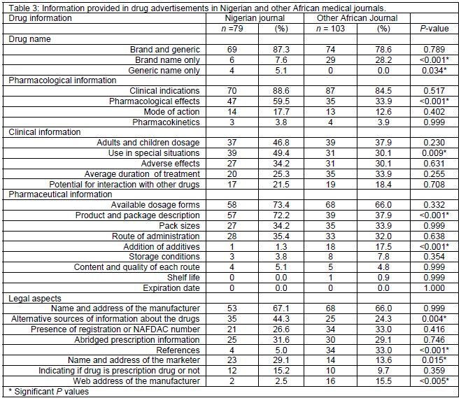 Results: Forty one pharmaceutical companies made 192 advertisements. 112 (58.3%) of these advertisements were made in the African medical journals. Pfizer (20.3%) and Swipha (12.5%) topped the list of the advertising companies. Four (2.1%) adverts mentioned generic names only, 157 (81.8%) mentioned clinical indications. Adults and children dosage (39.6%), use in special situations such as pregnancy and renal or liver problems (36.5%), adverse effects (30.2%), average duration of treatment (26.0%), and potential for interaction with other drugs (18.7%) were less discussed. Pharmaceutical information such as available dosage forms and product and package information {summary of the generic and proprietary names, the formulation strength, active ingredient, route of administration, batch number, manufactured and expiry dates, and the manufacturer on both the container and pack of the drug} were mentioned in 65.6% and 50% adverts, respectively. The product and package descriptions were provided in 57 (72.2%) Nigerian medical journals, which was significantly higher than in other African medical journals 39 (37.9%) (P<0.001).
