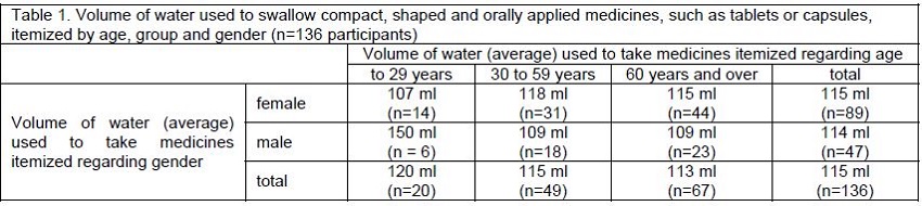 Results: 21 out of the 136 participants (15.4%) used only up to 60ml of liquid to take their tablets or capsules. Significant influences of demographic aspects, such as age or gender, on the volume of used liquid were not found. However, an increase in tablet or capsule size led to a significant increase in the volume of swallowed liquid.