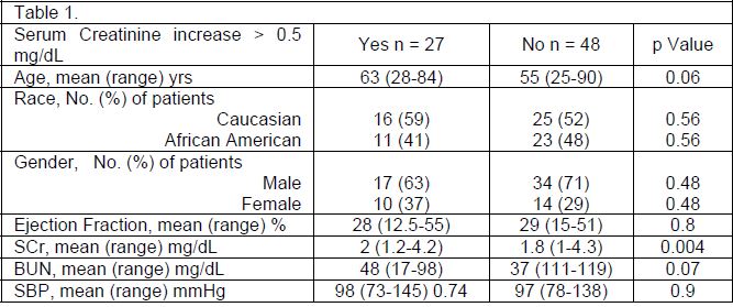 Baseline characteristics of patients the day nesiritide was initiated are presented in Table 1. The mean patient age was slightly higher in those patients who had an increase in SCr > 0.5 mg/dL (63 years versus 55 years, p=0.06). The average blood urea nitrogen (BUN) and SCr recorded the day of nesiritide initiation was 48 mg/dL and 2 mg/dL in patients who had an increase in SCr>0.5 versus 37 mg/dL (p=0.07) and 1.8 mg/dL (p=0.004) in those who did not. There was no difference in ejection fraction (28% versus 29%, p=0.8) or baseline systolic blood pressure (98 mmHg versus 97 mmHg, p=0.9).