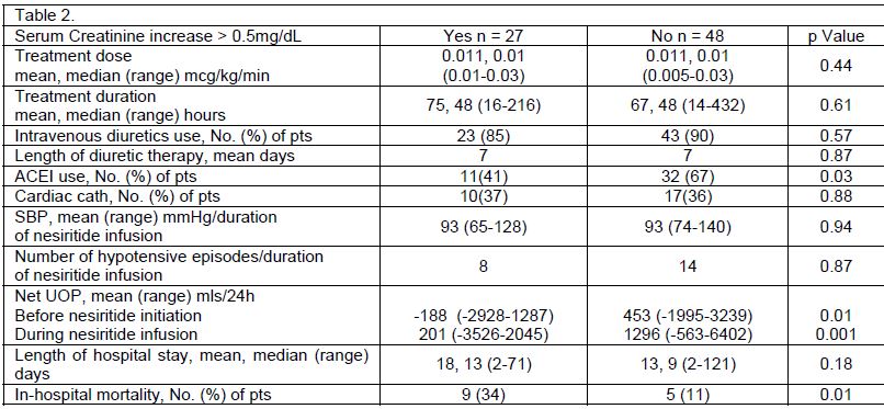 Methods: Seventy-five patients who were hospitalized for ADHF and who were treated with nesiritide for at least 12 hours were reviewed retrospectively.