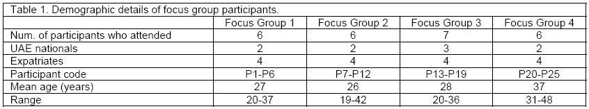Four different focus groups were separately held in a private rented hall in Dubai. The mean age ranges in the focus groups from 1 to 4 were 27, 26, 28, and 37 years old respectively. The fact that most of participants were young can be justified by taking into consideration that 50.74% of Dubai population’s age range between 20 and 34 years old.18 The discussions took an average of 1 to 1.5 hours and were conducted by a trained and well experienced interviewer (IKR). Appropriate probing questions were used when necessary to get more in-depth views from the participants (Interested readers may obtain a copy of the question guide and probes used).19 To obtain more complete ideas; participants were given freedom to express additional views on the topic at the end of the group discussion session. Group discussions were digitally recorded, transcribed verbatim, and the transcripts were supplemented with field notes that were taken during the discussions and immediately after. Two of the authors (IKR and ARA) listened to all audio recordings and IKR analyzed the transcripts for relevant content and themes. The thematic framework contained dominant themes that were refined as associations were made in order to provide explanations for findings.20,21
