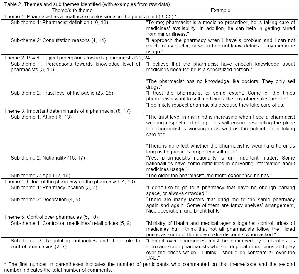 The most commonly identified theme was concerned with perceptions of the general public on the role of community pharmacists in Dubai. This was the only theme that was identified in all focus group discussions and a total of 35 codes were organized under this theme. The codes were further organized into two sub-themes: “who is a pharmacist to the general public?” and “reasons to seek pharmacists’ consultations.” Twenty-two out of the 25 participants defined a pharmacist as a medicine seller and prescriber. At a glance, it is interesting to add that 14 participants approached pharmacies in cases of minor illness, difficulties in reaching their physicians, and/or difficulties in using their medicines.