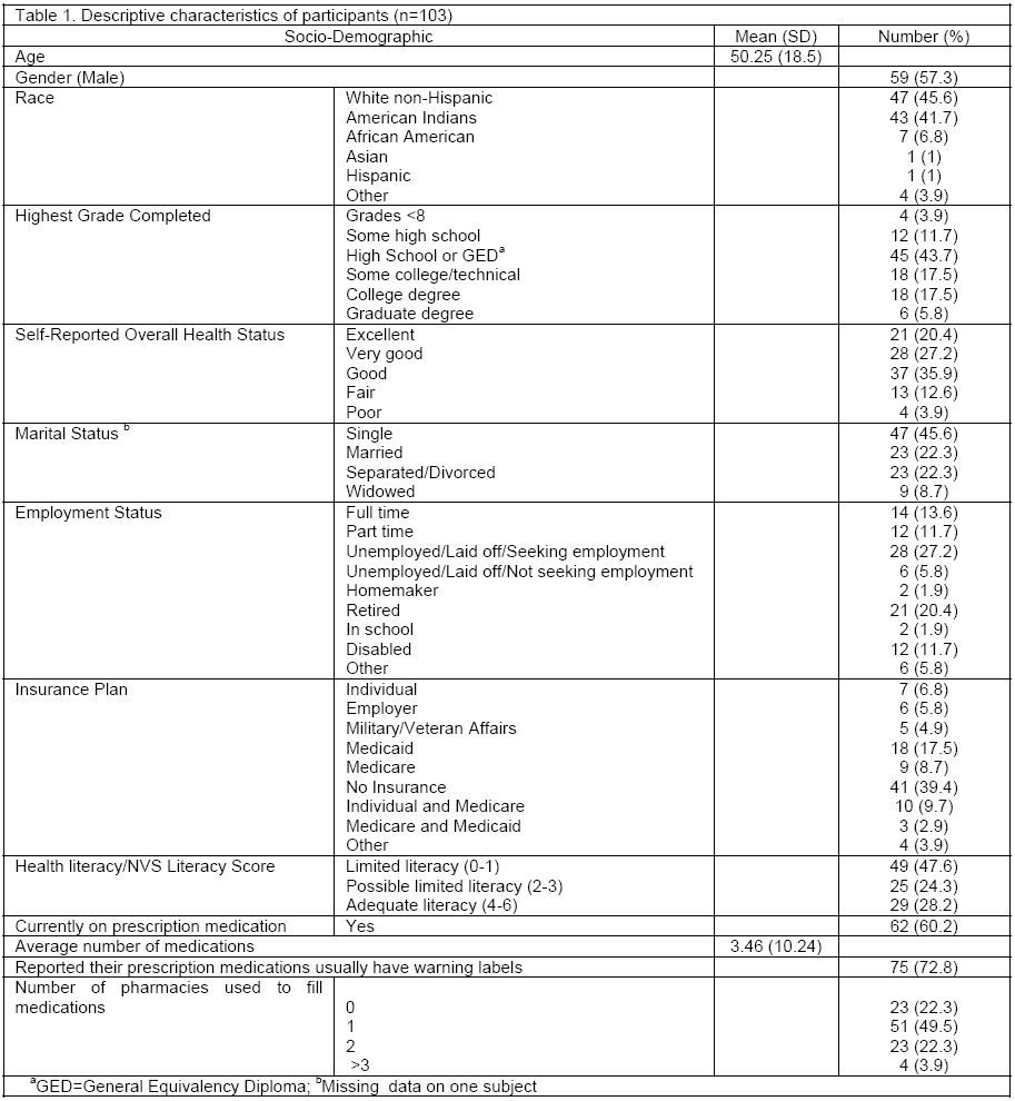 One hundred and three participants completed the study. The mean age of participants was 50.25 years (SD=18.05). The majority of participants were white males who had a high school degree as the highest grade completed, had a good overall health status, and had no health insurance. Most of the participants were currently taking a prescription medication and took an average of 3.46 (SD=10.24) medications (Table 1). Most participants had limited health literacy with a mean NVS score of 2.21 (SD=1.94) on a scale of zero to six.