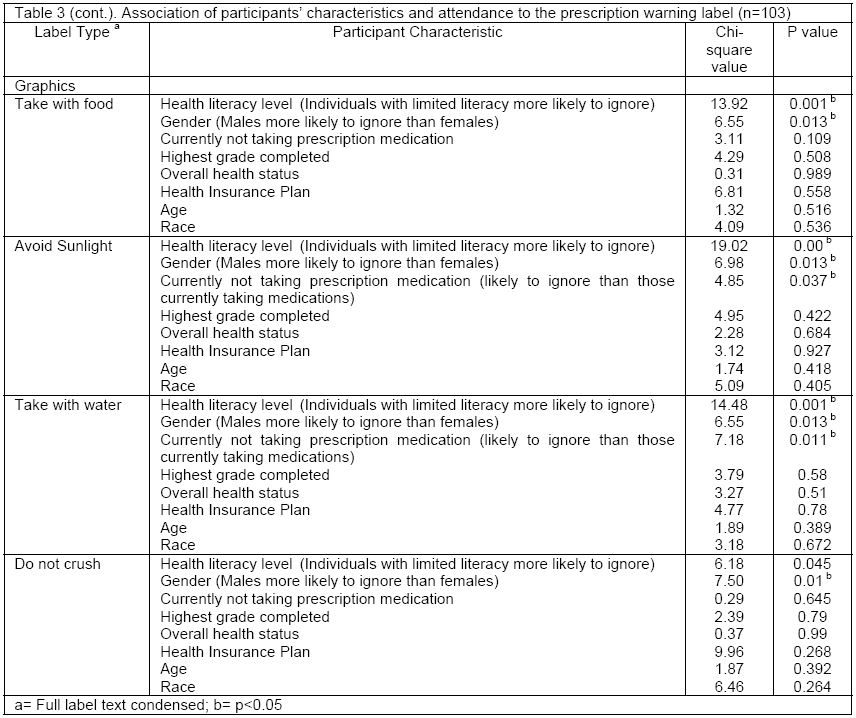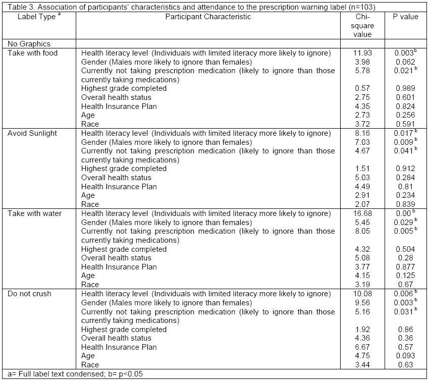 Regardless of whether the label had a graphic or not, there were no statistically significant relationships between age, race, highest grade completed, overall health status, health insurance, or whether they attended to the warning label and its instruction (Table 3). Among all the labels, participants with limited health literacy were likely to overlook the warning labels compared to those with adequate health literacy. In addition, males were more likely to overlook the warning labels compared to females (Table 3). For all labels except the graphic “Take with food” label and the graphic “Do not crush, swallow whole” label, participants not currently taking prescription medications were more likely to overlook the warning label compared to individuals currently taking medications (Table 3). Most participants thought the graphics on the label were helpful in their interpretation of the instructions. Compared to other race or ethnic groups, American Indians were more likely to indicate that having a label with graphics was helpful (chi-square=28.43, p=0.019). Most participants (n=75, 72.8%) stated that they looked at their warning labels when picking up their prescription from the pharmacy and rated the instructions on the label to be extremely important (n=86, 83.5%) (Table 4).