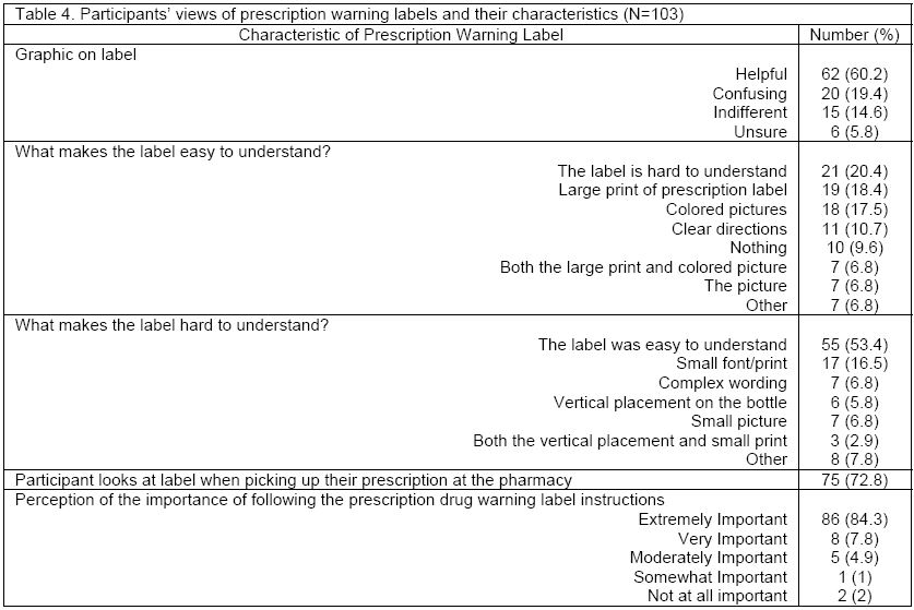 Participants’ views of prescription warning labels and their characteristics (N=103)