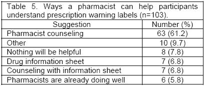 Most participants thought the pharmacist could help them in understanding prescription warning labels by counseling them on the information on the label (n=63, 61.2%) (Table 5).