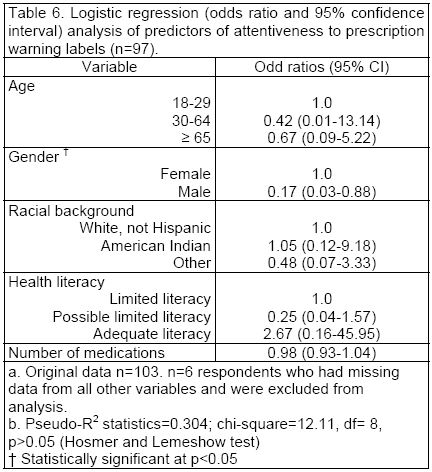 Logistic regression (odds ratio and 95% confidence interval) analysis of predictors of attentiveness to prescription warning labels (n=97).