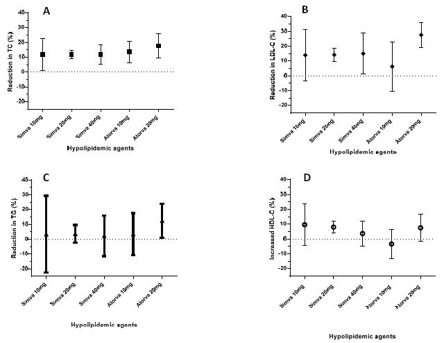 Changes in serum lipid profile after treatment with hypolipidemic agents at different dosages regimens. Values are the mean percentage reduction or increase of the analyses levels and the vertical bars represent 95% confidence interval, when comparing the results of the lipid profile before and after hypolipidemic therapy. Sample size 417 individuals. The dotted line (zero) indicates no change after treatment.