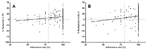 Patients who had adherence rate to hypolipidemic therapy lower than 55% did not present any reduction in total cholesterol. For the patients who had adherence rate from 55 to 80%, the reduction for total cholesterol was 0-7%; while the greatest reduction, of about 11%, was observed for the ones with an adherence rate higher than 80%. For LDL-cholesterol, adherence rates to the treatment lower than 60% had no therapeutic effectiveness. A significant reduction (14%) of LDL-cholesterol was only obtained with adherence rates higher than 80%.