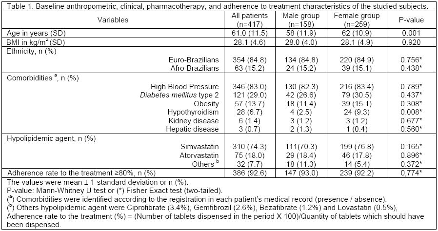 The characteristics of the patients included in the study group are shown in Table 1. The sample consisted of 417 patients, most of them were women (62.1%). The median Body Mass Index was 27.7 kg/m2. The most frequent comorbidities for both genders were hypertension (83%) and type 2 Diabetes mellitus (29%), followed by obesity (13.7%), hypothyroidism (6.7%), kidney disease (1.4%) and hepatic disease (0.7%). The statins were the most used hypolipidemic class (92.8%), and simvastatin 20 mg daily was the most frequent treatment prescribed. Ciprofibrate 100 mg daily was the most prescribed fibrate (3.4%).